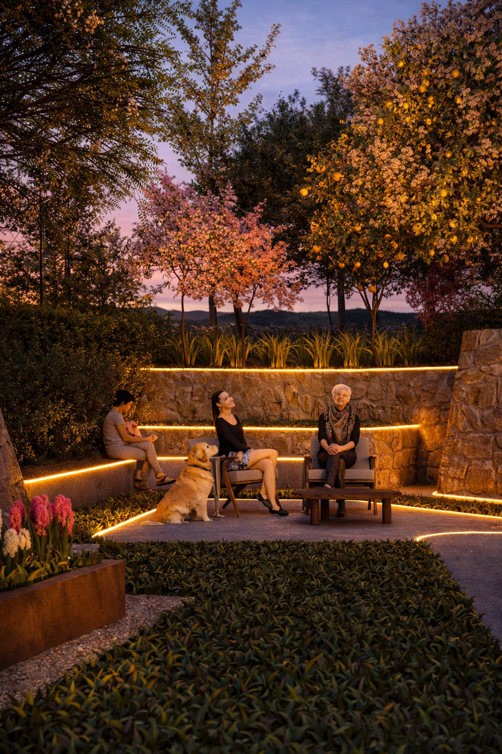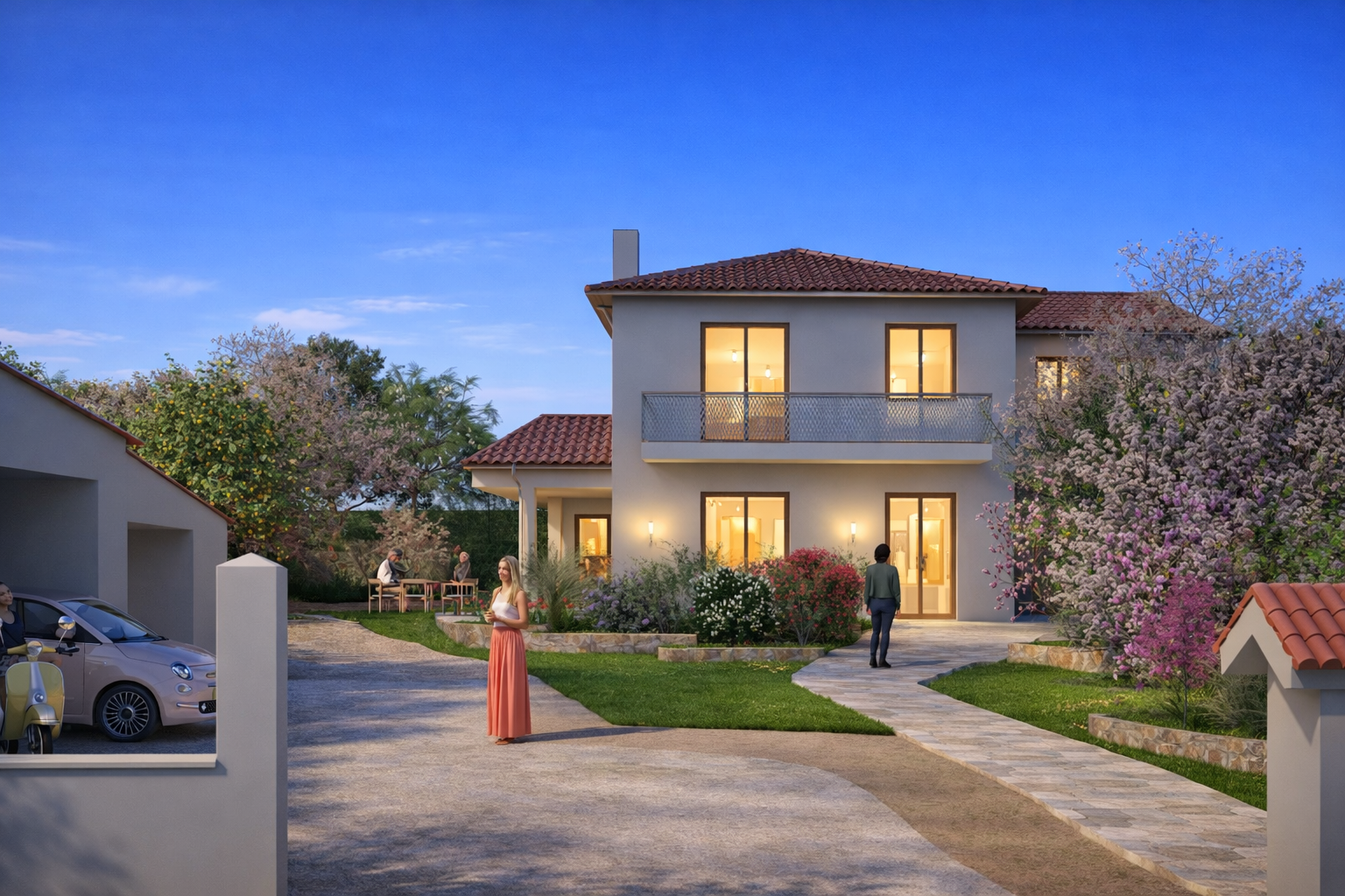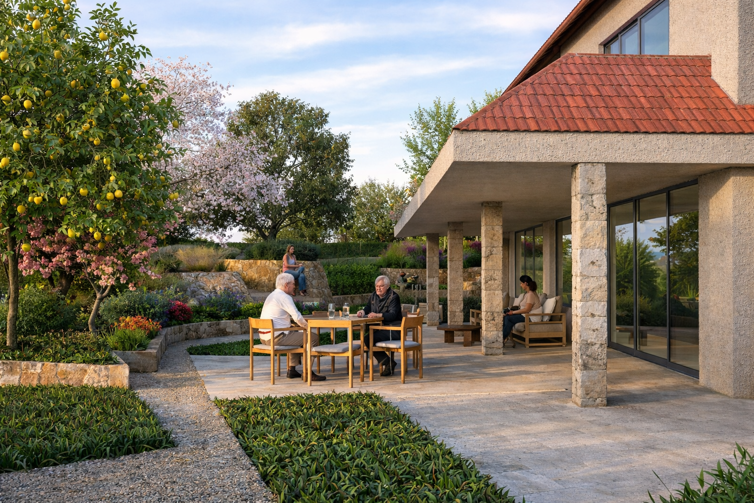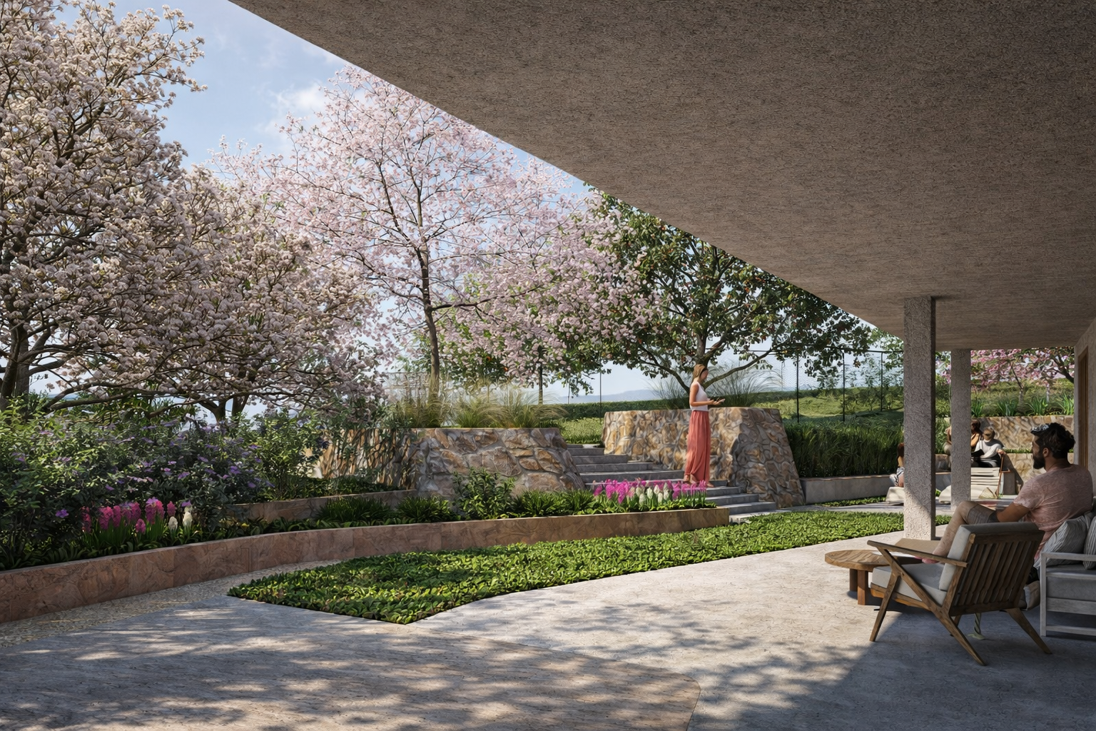 Συγκεκριμένα, στο μπροστινό τμήμα δημιουργούνται είσοδοι για πεζούς και οχήματα, ακολουθώντας τη φυσική κλίση του εδάφους, η οποία αξιοποιείται για τη δημιουργία χαμηλής βλάστησης.